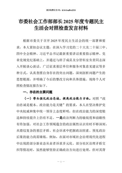 【七哥公文】2026年:市委社会工作部部长2025年度专题民主生活会对照检查发言材料+更多免费公文+VX:QiGeGongWen2024