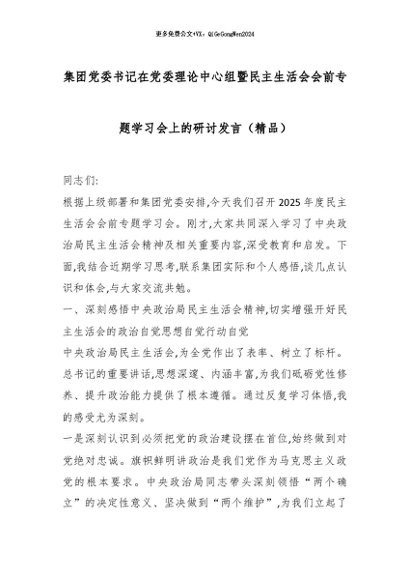 【七哥公文】2026年:集团党委书记在党委理论中心组暨民主生活会会前专题学习会上的研讨发言(精品)_副本+更多免费公文+VX:QiGeGongWen2024