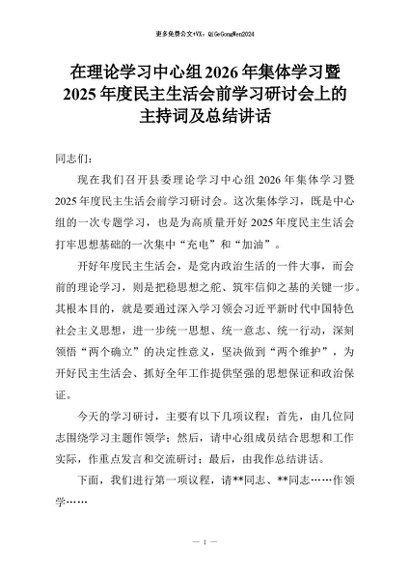 【七哥公文】2026年:在理论学习中心组2026年集体学习暨2025年度民主生活会前学习研讨会上的主持词及总结讲话+更多免费公文+VX:QiGeGongWen2024