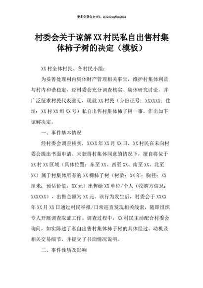 【七哥公文】2026年:村委会关于谅解XX村民私自出售村集体柿子树的决定(模板)+更多免费公文+VX:QiGeGongWen2024