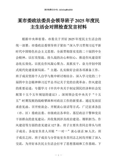 【七哥公文】2026年:某市委政法委员会领导班子2025年度民主生活会对照检查发言材料+更多免费公文+VX:QiGeGongWen2024