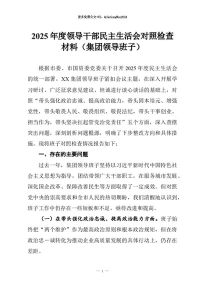 【七哥公文】2026年:2025年度领导干部民主生活会对照检查材料(集团领导班子)+更多免费公文+VX:QiGeGongWen2024