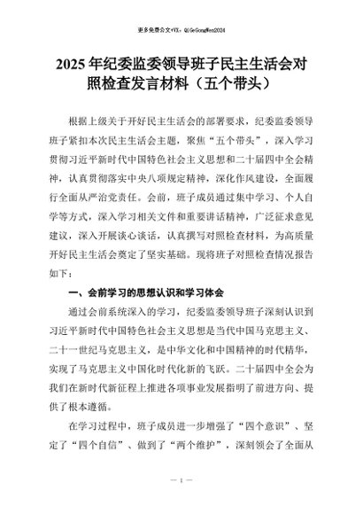 【七哥公文】2026年:2025年纪委监委领导班子民主生活会对照检查发言材料(五个带头)+更多免费公文+VX:QiGeGongWen2024