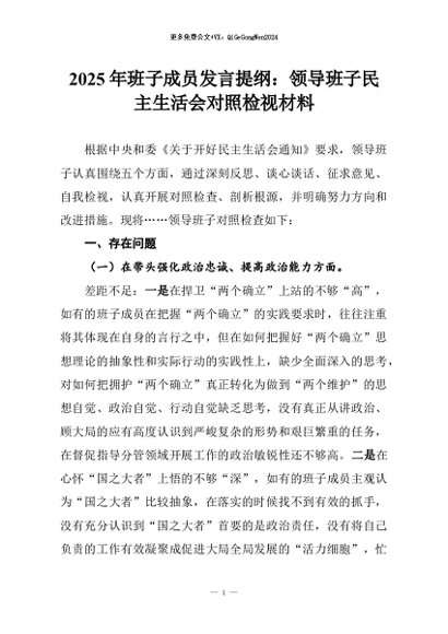 【七哥公文】2026年:2025年班子成员发言提纲:领导班子民主生活会对照检视材料+更多免费公文+VX:QiGeGongWen2024
