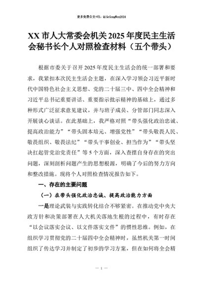 【七哥公文】2026年:XX市人大常委会机关2025年度民主生活会秘书长个人对照检查材料(五个带头)_副本+更多免费公文+VX:QiGeGongWen2024