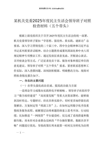 【七哥公文】2026年:某机关党委2025年度民主生活会领导班子对照检查材料(五个带头)+更多免费公文+VX:QiGeGongWen2024