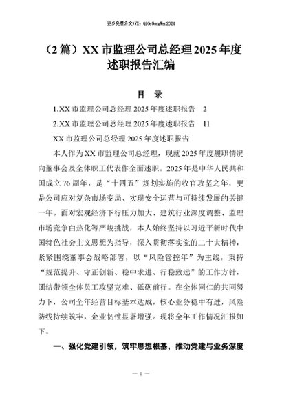 【七哥公文】2026年:(2篇)XX市监理公司总经理2025年度述职报告汇编+更多免费公文+VX:QiGeGongWen2024