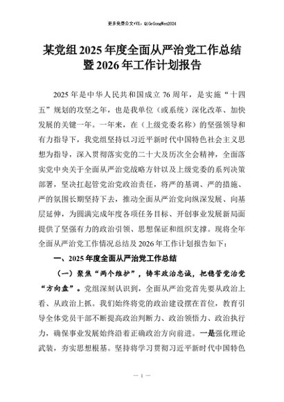 【七哥公文】2026年:某党组2025年度全面从严治党工作总结暨2026年工作计划报告+更多免费公文+VX:QiGeGongWen2024