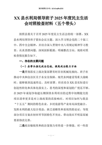 【七哥公文】2026年:XX县水利局领导班子2025年度民主生活会对照检查材料(五个带头)_副本+更多免费公文+VX:QiGeGongWen2024