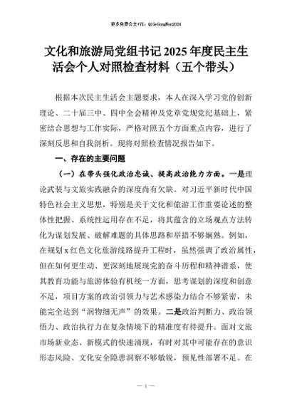 【七哥公文】2026年:文化和旅游局党组书记2025年度民主生活会个人对照检查材料(五个带头)+更多免费公文+VX:QiGeGongWen2024