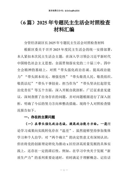 【七哥公文】2026年:(6篇)2025年专题民主生活会对照检查材料汇编+更多免费公文+VX:QiGeGongWen2024
