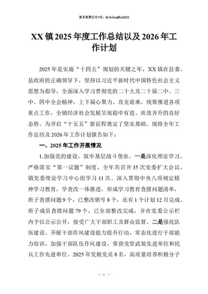 【七哥公文】2026年:XX镇2025年度工作总结以及2026年工作计划+更多免费公文+VX:QiGeGongWen2024