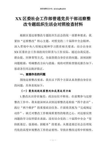 【七哥公文】2026年:XX区委社会工作部普通党员干部巡察整改专题组织生活会对照检查材料_副本+更多免费公文+VX:QiGeGongWen2024