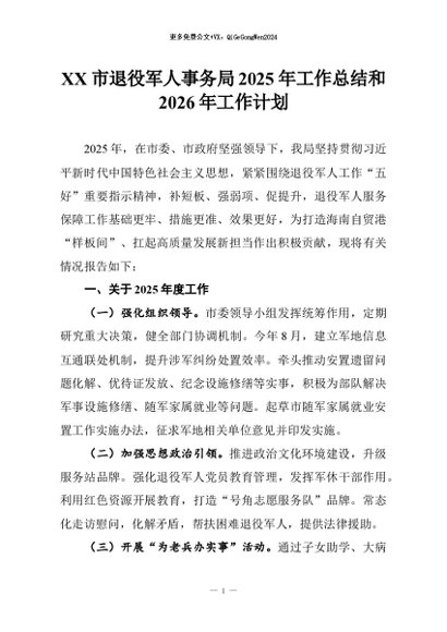 【七哥公文】2026年:XX市退役军人事务局2025年工作总结和2026年工作计划+更多免费公文+VX:QiGeGongWen2024
