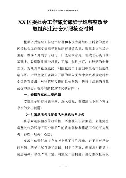 【七哥公文】2026年:XX区委社会工作部支部班子巡察整改专题组织生活会对照检查材料_副本+更多免费公文+VX:QiGeGongWen2024