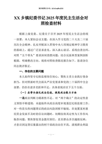 【七哥公文】2026年:XX乡镇纪委书记2025年度民主生活会对照检查材料_副本+更多免费公文+VX:QiGeGongWen2024