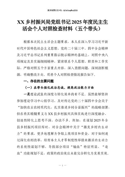 【七哥公文】2026年:XX乡村振兴局党组书记2025年度民主生活会个人对照检查材料(五个带头)_副本+更多免费公文+VX:QiGeGongWen2024