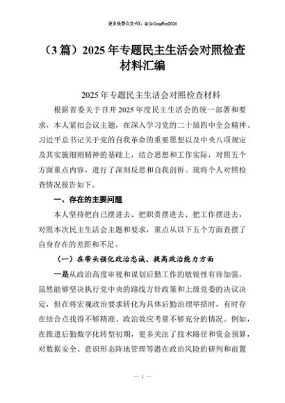 【七哥公文】2026年:(3篇)2025年专题民主生活会对照检查材料汇编+更多免费公文+VX:QiGeGongWen2024