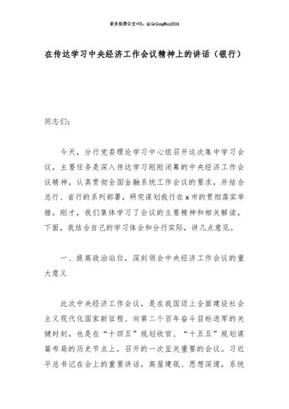 【七哥公文】2026年:在传达学习中央经济工作会议精神上的讲话(银行)_副本+更多免费公文+VX:QiGeGongWen2024