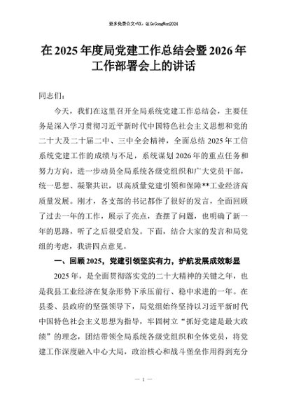 【七哥公文】2026年:在2025年度局党建工作总结会暨2026年工作部署会上的讲话+更多免费公文+VX:QiGeGongWen2024