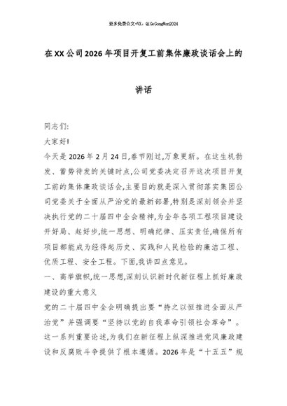 【七哥公文】2026年:在XX公司2026年项目开复工前集体廉政谈话会上的讲话_副本+更多免费公文+VX:QiGeGongWen2024