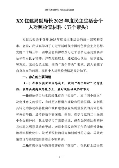 【七哥公文】2026年:XX住建局副局长2025年度民主生活会个人对照检查材料(五个带头)+更多免费公文+VX:QiGeGongWen2024