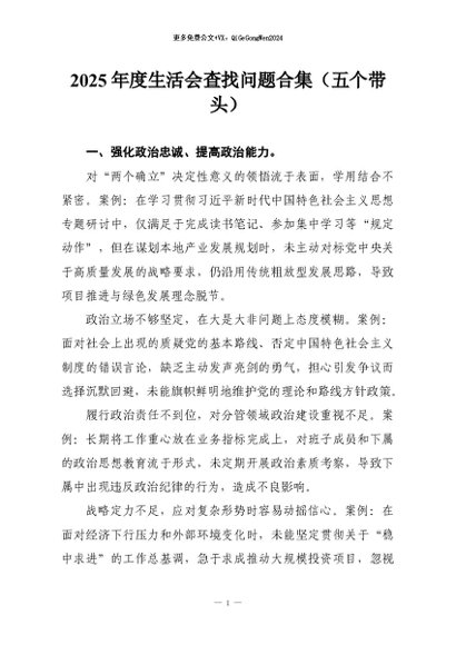 【七哥公文】2026年:2025年度生活会查找问题合集(五个带头)+更多免费公文+VX:QiGeGongWen2024