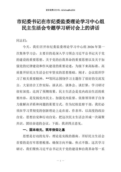 【七哥公文】2026年:市纪委书记在市纪委监委理论学习中心组民主生活会专题学习研讨会上的讲话+更多免费公文+VX:QiGeGongWen2024