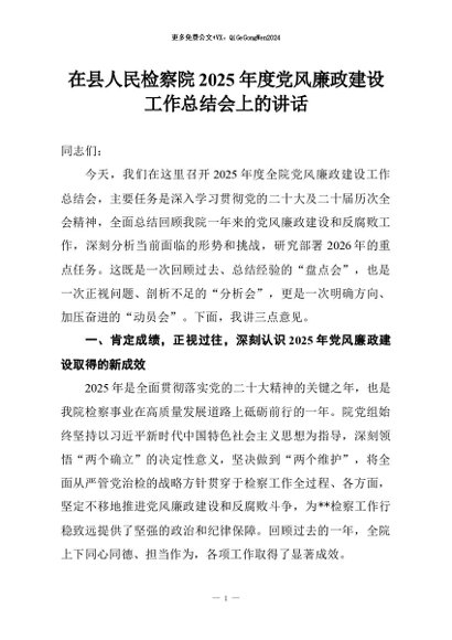 【七哥公文】2026年:在县人民检察院2025年度党风廉政建设工作总结会上的讲话+更多免费公文+VX:QiGeGongWen2024