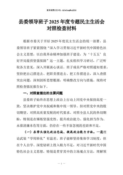【七哥公文】2026年:县委领导班子2025年度专题民主生活会对照检查材料+更多免费公文+VX:QiGeGongWen2024