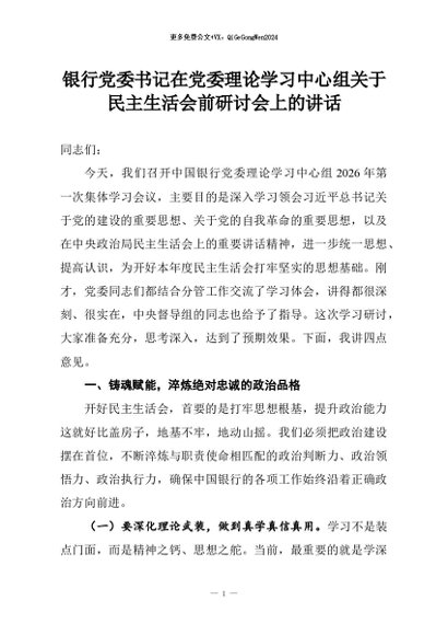 【七哥公文】2026年:银行党委书记在党委理论学习中心组关于民主生活会前研讨会上的讲话+更多免费公文+VX:QiGeGongWen2024