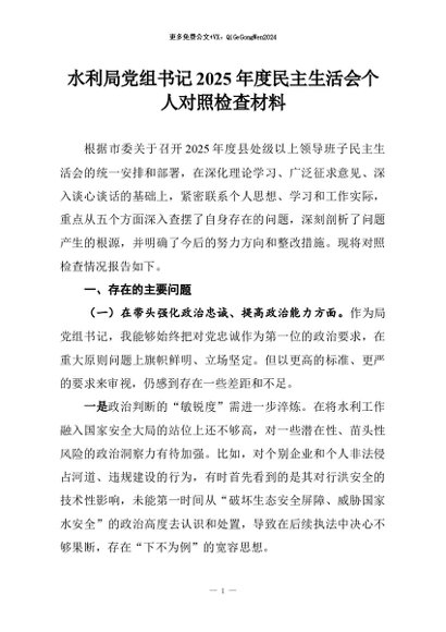 【七哥公文】2026年:水利局党组书记2025年度民主生活会个人对照检查材料+更多免费公文+VX:QiGeGongWen2024