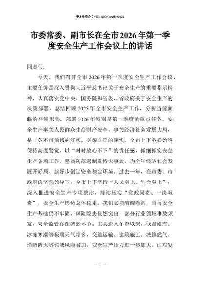 【七哥公文】2026年:市委常委、副市长在全市2026年第一季度安全生产工作会议上的讲话+更多免费公文+VX:QiGeGongWen2024