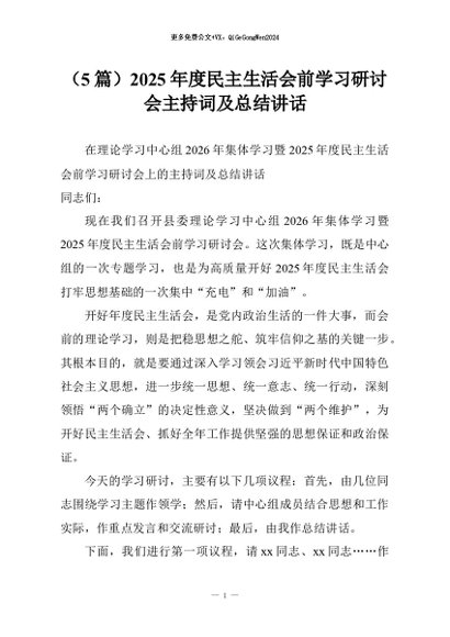 【七哥公文】2026年:(5篇)2025年度民主生活会前学习研讨会主持词及总结讲话+更多免费公文+VX:QiGeGongWen2024