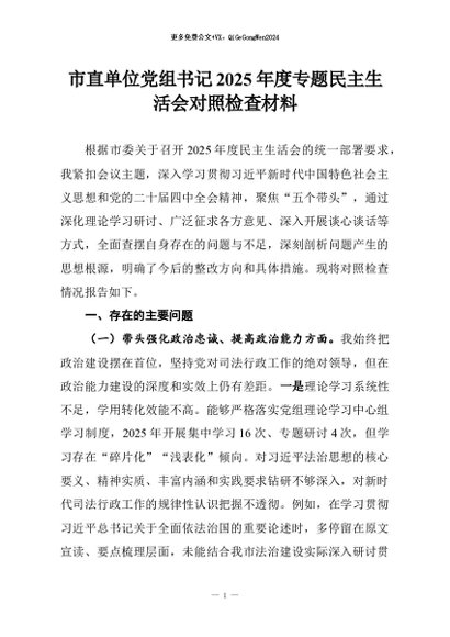 【七哥公文】2026年:市直单位党组书记2025年度专题民主生活会对照检查材料+更多免费公文+VX:QiGeGongWen2024