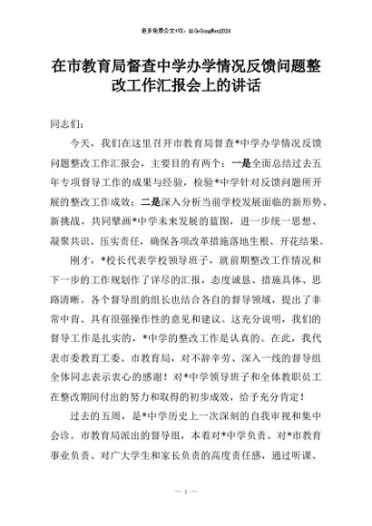 【七哥公文】2026年:在市教育局督查中学办学情况反馈问题整改工作汇报会上的讲话+更多免费公文+VX:QiGeGongWen2024