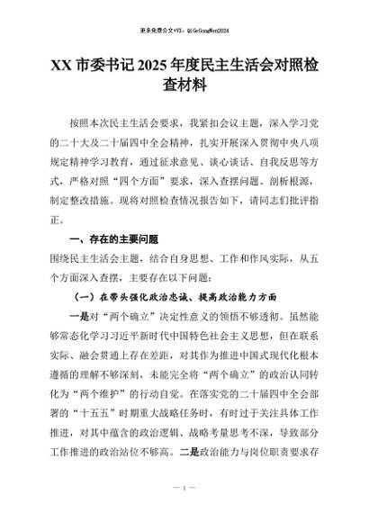 【七哥公文】2026年:XX市委书记2025年度民主生活会对照检查材料+更多免费公文+VX:QiGeGongWen2024