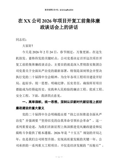 【七哥公文】2026年:在XX公司2026年项目开复工前集体廉政谈话会上的讲话+更多免费公文+VX:QiGeGongWen2024