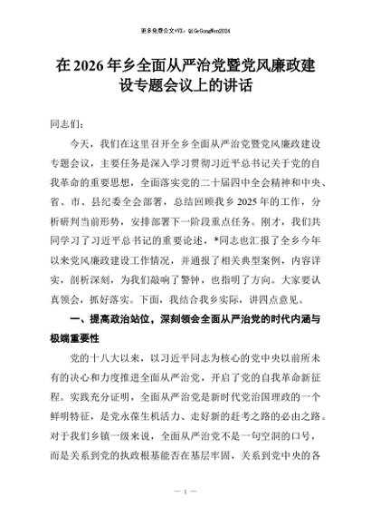 【七哥公文】2026年:在2026年乡全面从严治党暨党风廉政建设专题会议上的讲话+更多免费公文+VX:QiGeGongWen2024