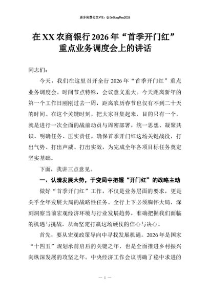 【七哥公文】2026年:在XX农商银行2026年“首季开门红”重点业务调度会上的讲话+更多免费公文+VX:QiGeGongWen2024
