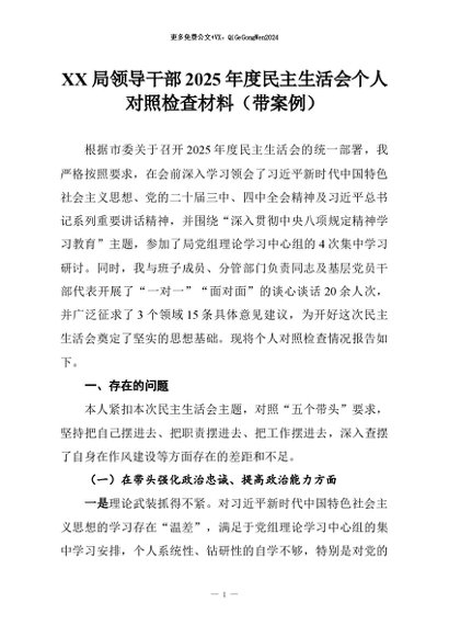 【七哥公文】2026年:XX局领导干部2025年度民主生活会个人对照检查材料(带案例)+更多免费公文+VX:QiGeGongWen2024