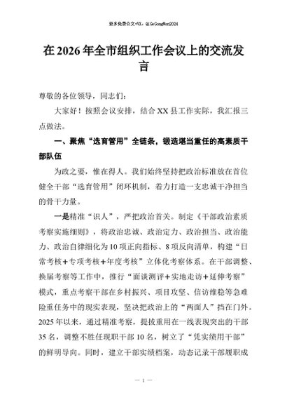 / 【七哥公文】2026年:在2026年全市组织工作会议上的交流发言+更多免费公文+VX:QiGeGongWen2024