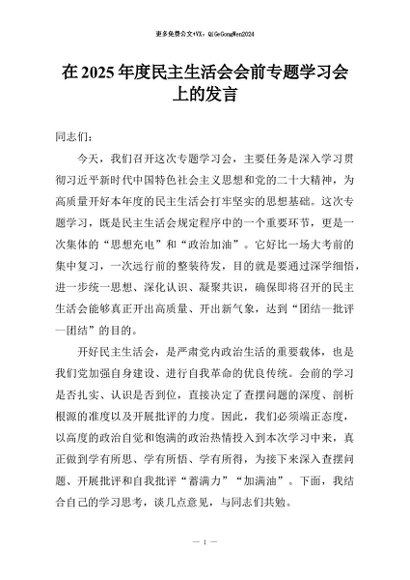 / 【七哥公文】2026年:在2025年度民主生活会会前专题学习会上的发言+更多免费公文+VX:QiGeGongWen2024
