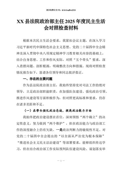 【七哥公文】2026年:XX县法院政治部主任2025年度民主生活会对照检查材料+更多免费公文+VX:QiGeGongWen2024