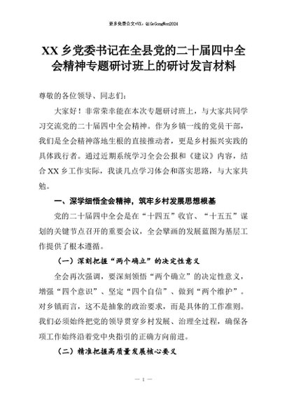 【七哥公文】2026年:XX乡党委书记在全县党的二十届四中全会精神专题研讨班上的研讨发言材料+更多免费公文+VX:QiGeGongWen2024
