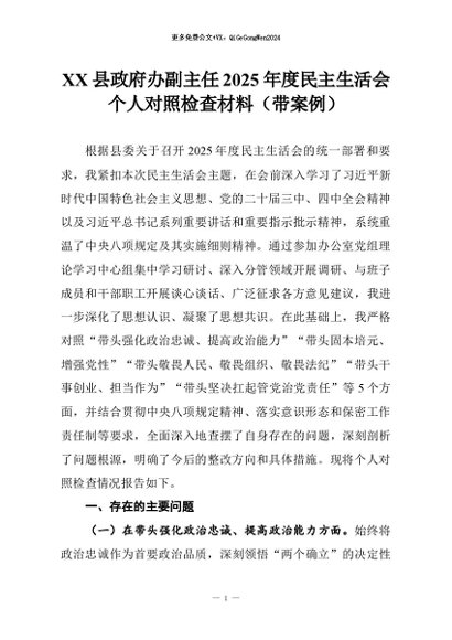 【七哥公文】2026年:XX县政府办副主任2025年度民主生活会个人对照检查材料(带案例)+更多免费公文+VX:QiGeGongWen2024