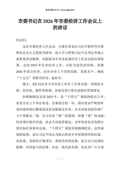 / 【七哥公文】2026年:市委书记在2026年市委经济工作会议上的讲话+更多免费公文+VX:QiGeGongWen2024