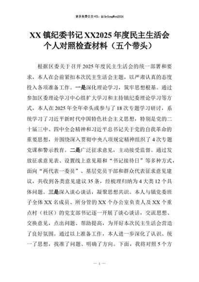 【七哥公文】2026年:XX镇纪委书记XX2025年度民主生活会个人对照检查材料(五个带头)+更多免费公文+VX:QiGeGongWen2024