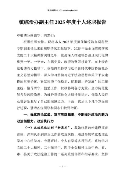 / 【七哥公文】2026年:镇综治办副主任2025年度个人述职报告+更多免费公文+VX:QiGeGongWen2024