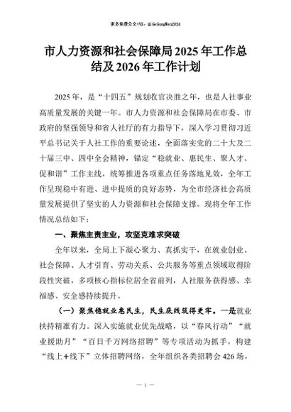 【七哥公文】2026年:市人力资源和社会保障局2025年工作总结及2026年工作计划+更多免费公文+VX:QiGeGongWen2024